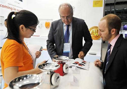 在廣交會一期上,兩位采購商在一個電子秤展位前瀏覽產品介紹。為期5天的廣交會第一期于4月19日結束。受歐債危機隱憂持續(xù)、歐元區(qū)經濟衰退風險加劇以及新興經濟體面臨通貨膨脹和經濟增速回落疊加影響,本屆廣交會一期成交較上年同期和上一屆,均有一定幅度的下滑。據統計,機電產品累計成交額188億美元,占全部成交額的83.9%,較上年春季廣交會同期下降5.5%,較第110屆秋交會下降9.5%。