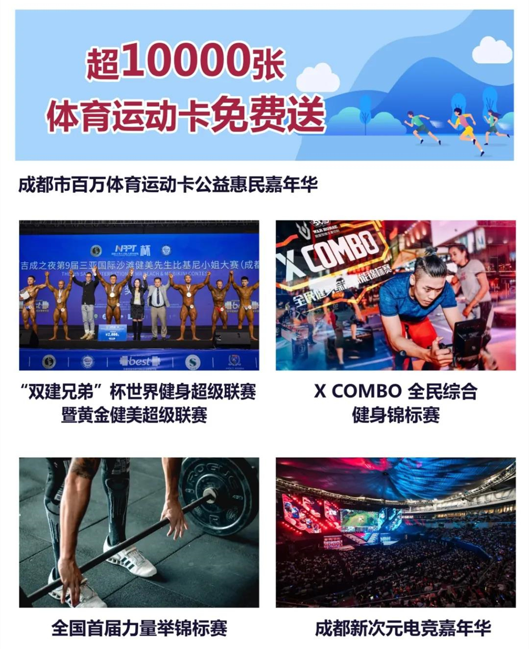 它還有2020xcombo綜合健身錦標賽、成都新次元電競嘉年華等更多面向全成都體育運動愛好者的賽事活動,以及面向青少年的體育運動培訓,面向健身康體、戶外運動、場館設施企業的展覽展示,將打造一場全民參與,全民共享的體育運動狂歡盛宴。